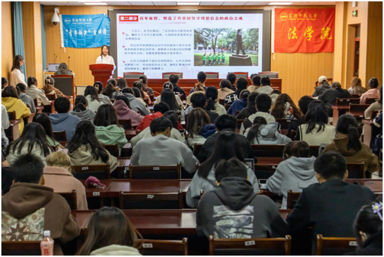 在反帝爱国斗争中慷慨就义的黄爱、在滚滚洪水中转移群众英勇牺牲的彭志龙、留下“清澈的爱,只为中国”宣言的18岁小战士陈祥榕……宣讲团成员、思想政治教育专业2022(1)班的戴楠向同学们介绍了不同时代下奉献的青年。“我们要坚定理想信念,筑牢精神之基,厚植爱国情怀。”她号召大家矢志不渝跟党走,以实现中华民族伟大复兴为己任。