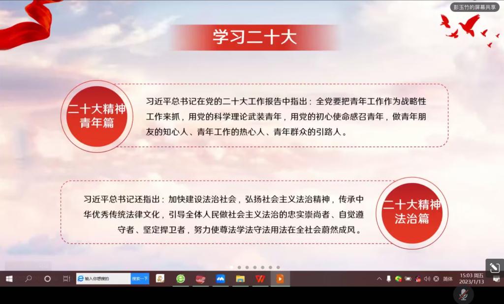 1月13日,太阳集团tyc9728邀请校青年讲师团作党的二十大精神主题宣讲。青年讲师团成员、法学专业2020(1)班的彭玉竹围绕“生逢其时更要奋斗其时”的主题作报告。此次宣讲以线上方式开展,公司2022级各班员工代表和员工会全体成员聆听学习。