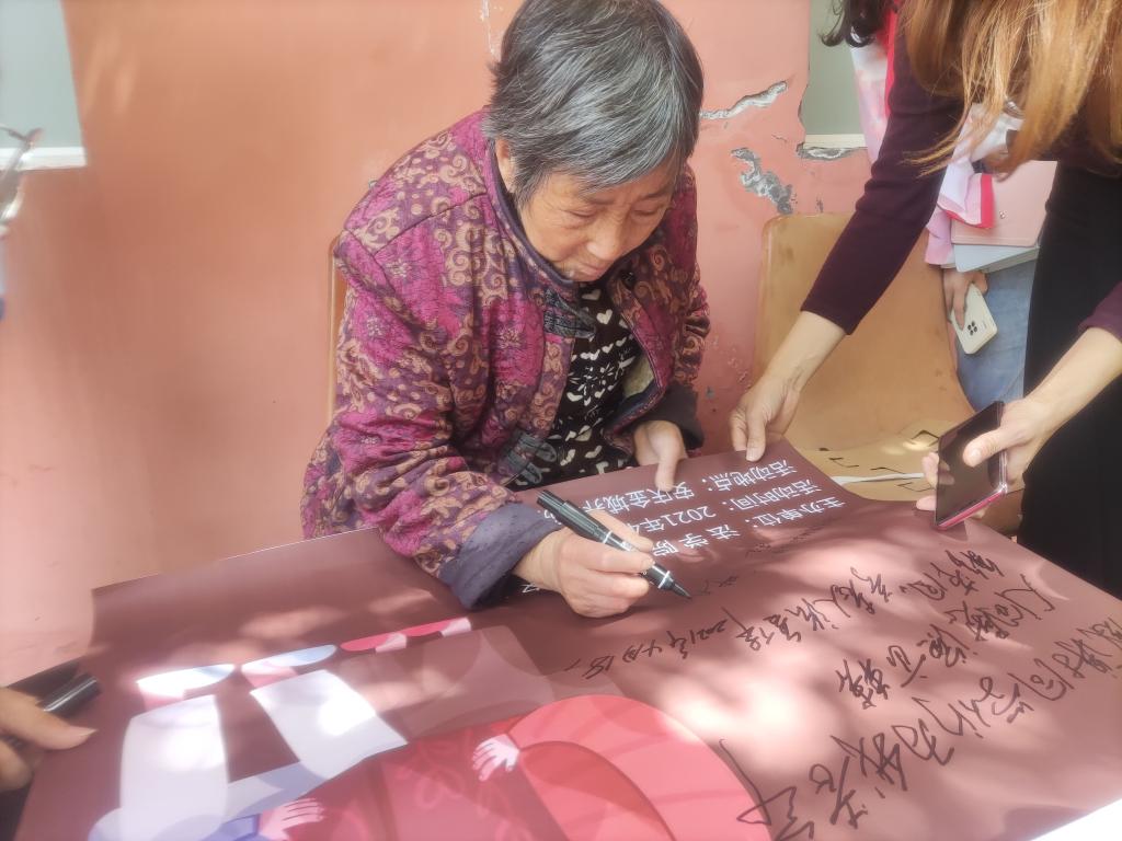在了解今年恰逢建党百年时,很多老人激动地在海报上留言签字,表达对祖国和党的祝福。“感谢党的温暖。”“祝党百岁快乐!”“万岁!”老人们用颤抖的手写下这些话,虽然很累,但他们很开心。老党员爷爷更是激动不已,虽然口齿不清,但仍用笔写下最铿将有力的语句:“祝党越来越好。”爷爷1948年入党,参与过农村解放斗争,与党一同奋斗的时间较长,对党抱有最真挚的情感,至今仍不忘党恩国情。