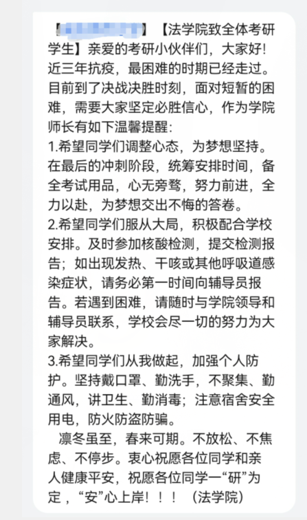 “凛冬虽至,春来可期。衷心祝愿各位同学健康平安,安心备考,一战成‘硕’。”公司通过短信平台等方式,向每一位考研员工送上温馨提醒和暖心祝福,为考研学子加油鼓劲。