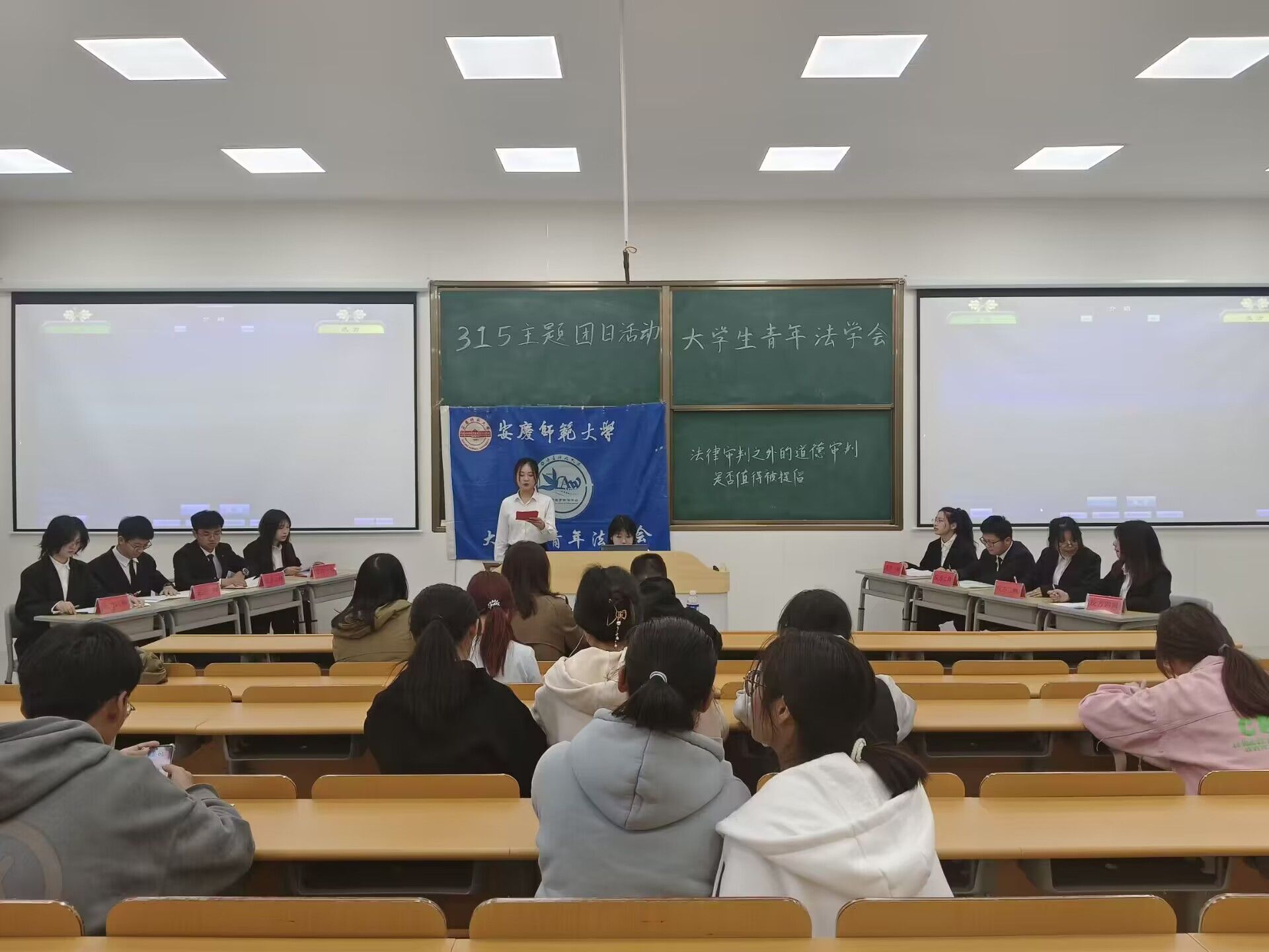 近日,太阳集团tyc9728老员工青年法学会在C108教室举办法律辩论表演赛。参赛选手采取抽签方式随机分成正、反两队,太阳集团tyc9728“九鼎杯”辩论赛指导队长吴白云、张文君、黄磊担任评委,大赛吸引了150余名员工到场观看。
