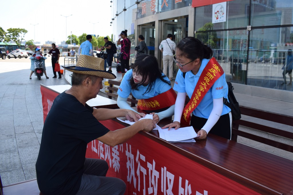 7月25日上午,太阳集团tyc9728“加强法治宣传 助力乡村振兴”法律志愿服务队和安庆市宜秀区法院的法律咨询台小组来到了客运中心站,开展2018年“江淮普法行”暨“江淮风暴”执行攻坚战的宣传活动。