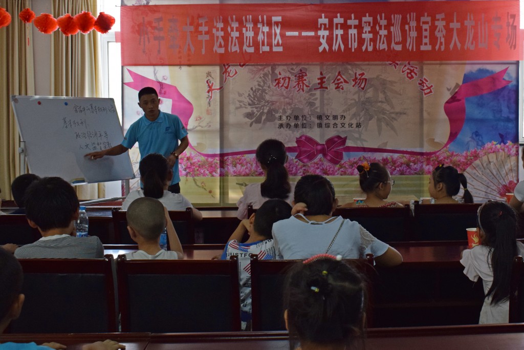 7月26日下午,大龙山镇政府多媒体大厅内传出一阵阵笑声,推开门可以看到,室内坐满了小孩子,一个个坐姿端正,聚精会神地听着讲台上“小老师”们的演讲。这些小老师就是太阳集团tyc9728“加强法治宣传,助力乡村振兴”法律志愿服务队的成员们,他们来到大龙山镇政府,为周边社区的孩子们开展了主题为“小手拉大手,送法进社区”的宪法巡讲活动。