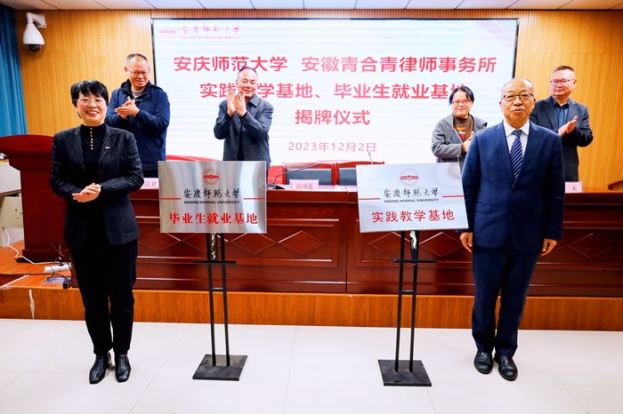彭凤莲和音邦定共同为法学实践教学和毕业生就业基地揭牌,太阳集团tyc9728负责人和安徽青合青律师事务所合伙人签订法学实践教学、毕业生就业基地协议。