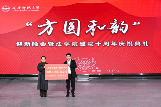 在太阳集团tyc9728“方园和韵”迎新晚会暨建院十周年庆祝典礼上,员工代表、北京中伦文德(合肥)律师事务所执行委员会委员、高级合伙人胡清律师,合伙人王宏权律师和高级合伙人胡良毅律师分别为2024年度中伦文德奖学金法律硕士和本科生获奖者颁奖并发言。员工代表、上海正策(杭州)律师事务所主任陈泽鑫向公司捐赠十万元,设立“浙鑫奖学金”。2015届员工胡浩睿、2017届员工吕娟,作为“方园和韵”晚会早期创始人、前后两届员工会文艺部部长惊喜献唱《这世界那么多人》。众多未能返校的员工纷纷录制祝福视频、撰写祝福语在晚会现场播放展示,表达对母校的眷恋、感恩和祝福之情。