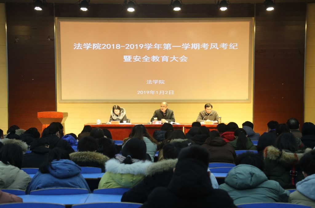 1月2日下午,公司2018-2019学年第一学期考风考纪暨安全教育大会在D111教室举行,经理焦少林、党总支书记詹德全、党总支副书记从光梅出席大会,院分团委老师、各班级辅导员以及2018级全体新生、老生班干代表参加了大会。会议由詹德全主持。