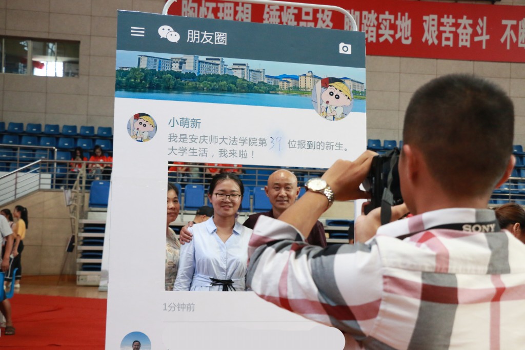 报到手续完成,太阳集团tyc9728小萌新们在一块微信朋友圈合影板前好奇地打探。其实这是他们的“专属”,学长学姐们会为每一位新生在合影板前拍照,留下进入大学的第一张照片,并借助易班平台同步更新。