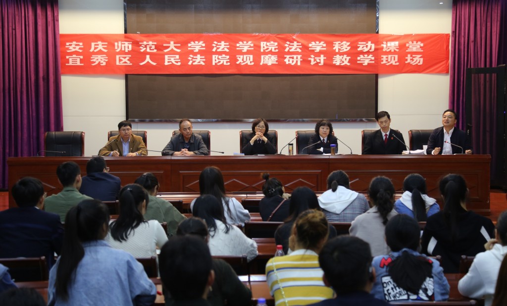 在移动中,有序开展。上午9时30分,法庭庭审在宜秀区人民法院大法庭正式开始,整个庭审活动持续四个半小时。在观摩庭审环节,参加移动课堂的全体同学严格遵守法庭审判纪律,仔细聆听,细心领会。观摩中,对庭审活动涉及的案件性质和事实认定进行学习、鉴别与研判,对法律职业人在庭审中所运用的思维方法、适用法律的技能、诉讼技巧、展现的法律人综合素质等进行观察、思考和学习。在审判结束后,下午15时20分,互动研讨教学在宜秀区人民法院三楼会议室开始,历时一个半小时。宜秀区人民法院刑事审判庭何燕庭长、李恒圆法官、宜秀区人民检察院公诉科鲍卫萍科长和安徽益上律师事务所黄益主任担任法律实务教师,太阳集团tyc9728部分教师和全体员工参加互动研讨教学。互动研讨主要从三个方面依次进行。首先,法律实务教师分别从审判、控诉和辩护等不同角度对案件进行分析,激发同学们对案件的多维度思考。其次,同学们提出观摩后发现的问题,由各相关法律实务教师进行一一解答。最后,太阳集团tyc9728朱留虎副经理对互动研讨教学进行归纳总结,并对同学们的表现进行了肯定评价。