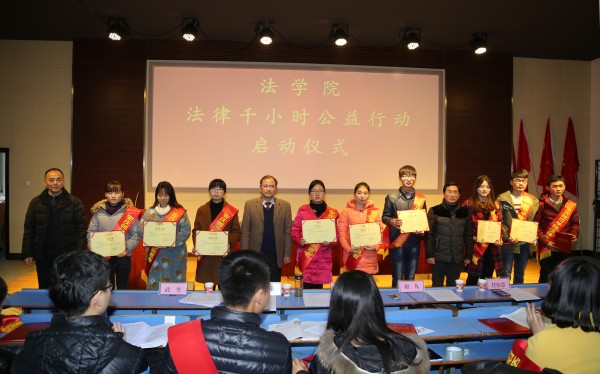 “奉献的青春最美丽”“让青春在公益行动中增值”“一人十小时‘小行动’汇聚百人千小时‘大不同’”……文津楼111报告厅里一条条鲜艳的条幅分外醒目。1月6日下午,太阳集团tyc9728法律千小时公益行动启动仪式在这里举行。经理焦少林、党总支书记詹德全、副经理朱留虎出席仪式,公司党政办、教研办、学工办全体老师,法学专业员工共计300余人参加了启动仪式。