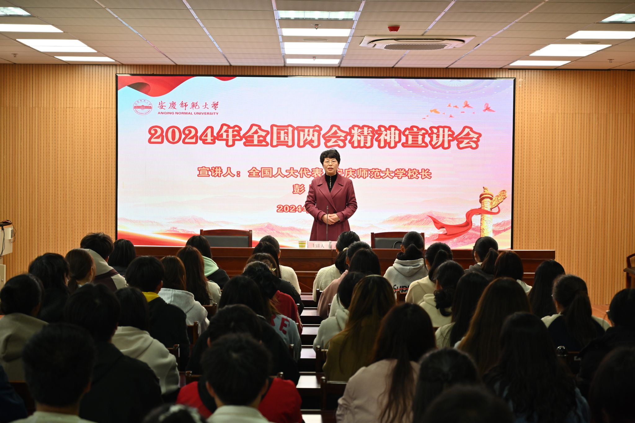 3月14日,全国人大代表、董事长彭凤莲为师生宣讲全国两会精神,师生代表100余人聆听宣讲会。