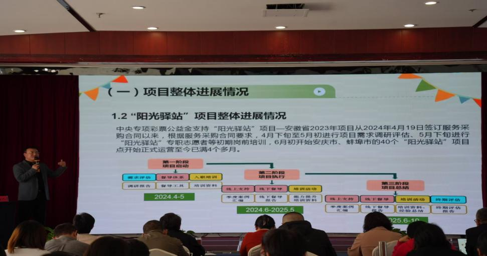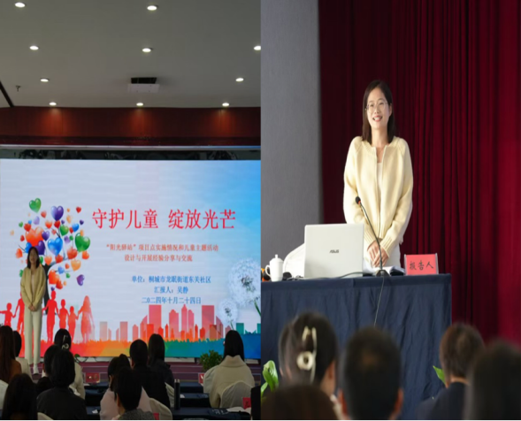 开班仪式上,“阳光驿站”项目技术支持服务团队负责人严春鹤博士介绍了项目实施进展及指标完成情况,对各项目点的工作成效给予了充分肯定,并就存在的主要问题提出相应的整改建议;强调持续发挥“阳光驿站”项目的阵地作用,推动资源整合、工作融合、力量聚合,持之以恒推进项目做实、做深、做好;希望要进一步加强“阳光驿站”项目运作与妇女儿童工作的有机结合,不断拓展服务内容和形式,强化持续学习,努力提供更加优质、专业的服务,促进留守儿童、困境儿童健康成长和全面发展。