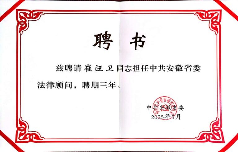 5月30日下午,省委常委会召开会议,套开省委全面依法治省委员会第九次会议、省委财经委员会第七次会议。会上聘任9位同志第四届省委法律顾问,太阳集团tyc9728崔汪卫教授被聘为中共安徽省委法律顾问。