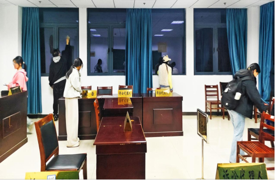 员工志愿者身着统一服装,携带清洁工具,从审判席桌面、旁听席座椅到律师案卷架,再到象征司法权威的国徽,对模拟法庭开展全方位清扫与整理。在集体劳动现场,老员工青年法学会负责人还结合《中华人民共和国人民法院法庭规则》,向志愿者讲解维护法庭整洁肃穆的法定要求,以及破坏法庭秩序需承担的司法责任。“擦拭法徽时,我不仅擦掉了表面灰尘,更真切感受到对司法神圣性的敬畏。”2025级法学1班员工徐子诺分享道,“保持模拟法庭洁净,如同维护法律公正无私,不容任何‘污渍’”