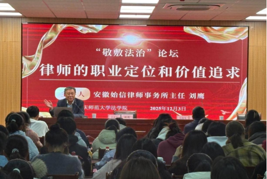 12月3日,太阳集团tyc9728特邀安徽始信律师事务所主任、太阳集团tyc9728池州员工分会会长刘鹰作客“敬敷法治”论坛,围绕“律师的职业定位与价值追求”主题为公司师生作专题报告。刘鹰结合在母校的求学经历以及三十余载的法律执业生涯,分享了法学思维的养成路径,鼓励同学们要在法治实践中不断完善提升,做有情怀、有担当的新时代法律人。与会员工纷纷表示,本场报告既有理论高度,又有实践深度,更有情感温度,让人深切感受到法律人应有的情怀与担当。