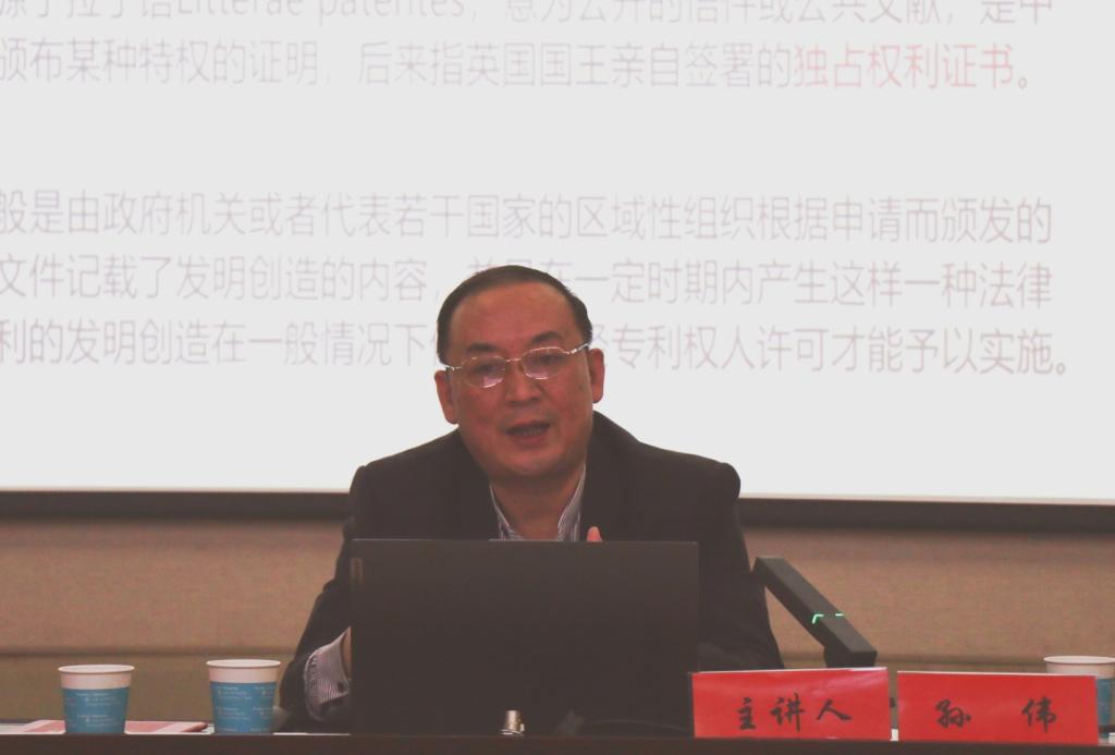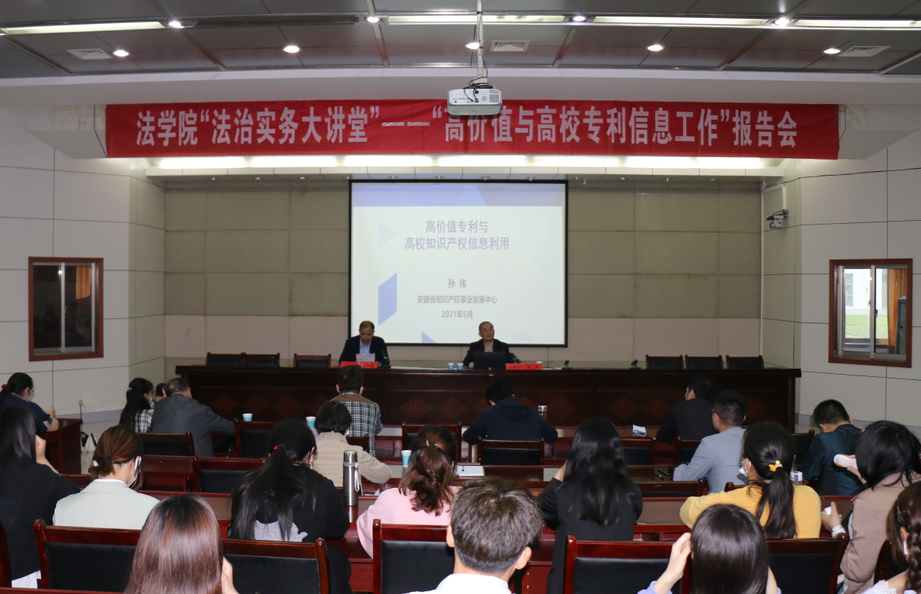 5月19日下午,安徽省知识产权事业发展中心二级调研员孙伟受邀法治实务大讲堂作了题为“高价值专利与高校知识产权信息利用”的学术报告。本次报告会是在校五月活动月之际,由校科研处、太阳集团tyc9728共同举办的。公司师生及安庆市知识产权局部分领导近200人参加了报告会。