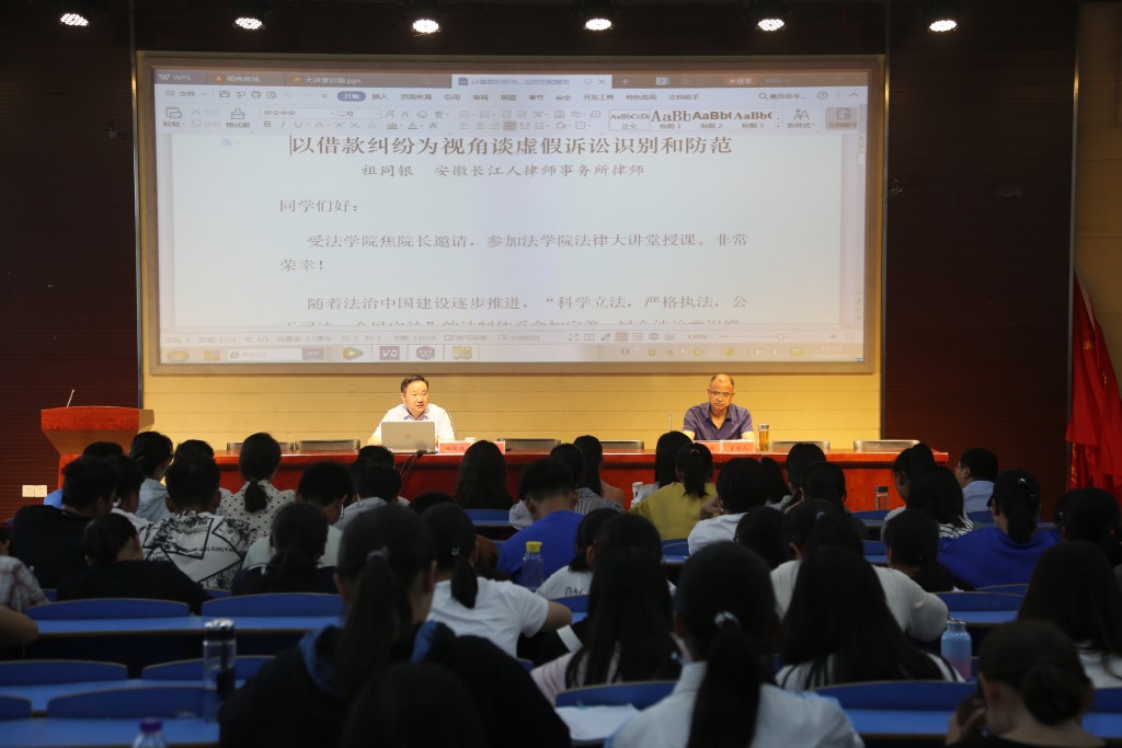 9月25日,安徽长江人律师事务所祖同银律师应邀莅临法律实务大讲堂,以“以借款纠纷为视角谈虚假诉讼识别和防范”为题作专题讲座。太阳集团tyc9728部分教师、全体2019级法律硕士研究生和2018级部分本科生共160余人聆听了报告。经理焦少林教授主持了讲座。