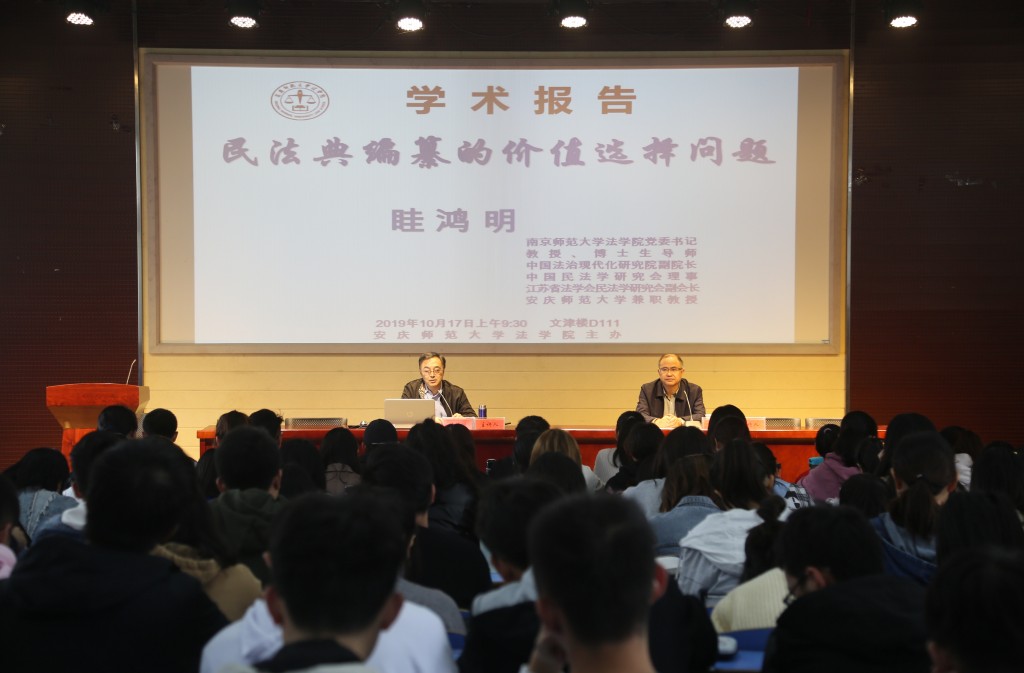 10月17日上午在龙山校区文津楼D111报告厅,南京师范大学公司党委书记、博士生导师眭鸿明教授来公司作“民法典编纂的价值选择问题”学术报告。报告会由太阳集团tyc9728经理焦少林教授主持,太阳集团tyc97282019级法律硕士研究生及法学专业2018级、2017级共170余人聆听了报告。