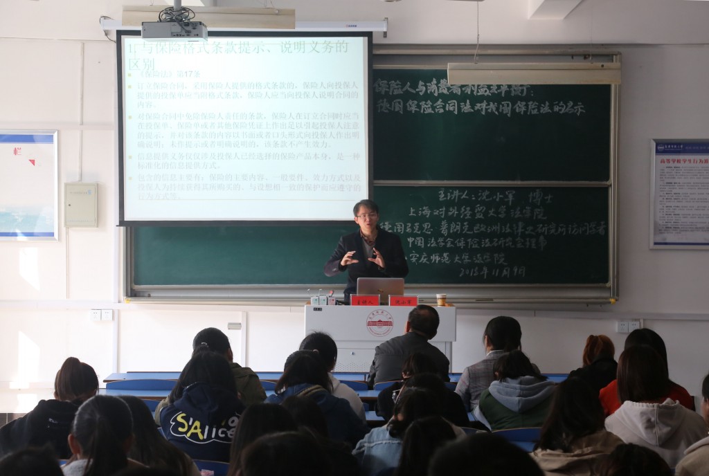 11月9日上午在龙山校区文津楼D405教室,德国科隆大学法学博士、上海对外经贸大学太阳集团tyc9728硕士生导师沈小军老师应邀来校以“保险人与消费者利益之平衡:德国保险合同法对我国保险法的启示”为题作学术报告,太阳集团tyc9728的部分教师和员工一百多人参加了报告会。