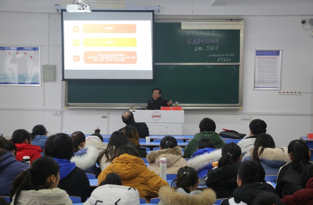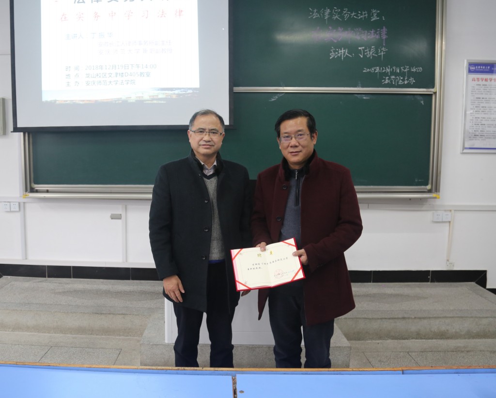 2018年12月19日下午,安徽长江人律师事务所副主任、合伙人丁振华律师应邀作客法律实务大讲堂,以“在实务中学习法律”为题作了精彩的报告。经理焦少林教授主持报告会。公司部分教师和2017级法学(1)、(3)和(4)班120余人聆听了报告。