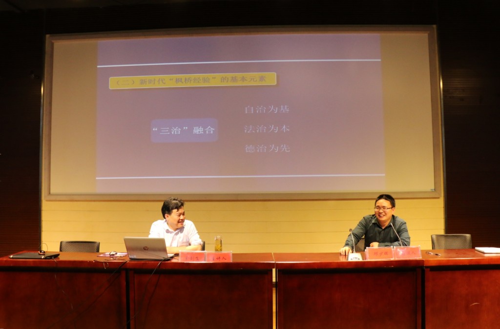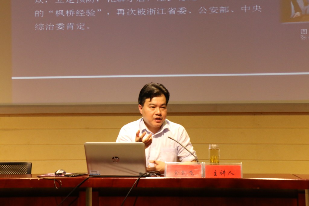 余钊飞副教授从“枫桥经验”的形成、发展和创新三个方面依次展开,由古到今举出国家法律暂时无法解决的现实问题,指出了“枫桥经验”落实发展的必要性。“枫桥经验”不断理论化、制度化和国际化的提升也体现我国对基层法治建设的日益重视,其发展基于现实与国情,补充了法治治理的不足。“枫桥经验”的历史发展分为了极其重要的几个阶段,余钊飞副教授用诙谐幽默的举例叙说了其历史发展过程,主张其真正的意义是人的权利不断增长和权利由不平等走向平等的进程。余钊飞副教授也提出了新时代“枫桥经验”的概念,认为它是具有典型意义和示范作用的基层社会治理方法,是在党的领导下,由枫桥等地人民创造和发展起来的。我们要贯彻新时代“枫桥经验”的基本元素,自治为基,法治为本,德治为先。在报告过程中,会场气氛热烈,不时爆发出雷鸣般的掌声。