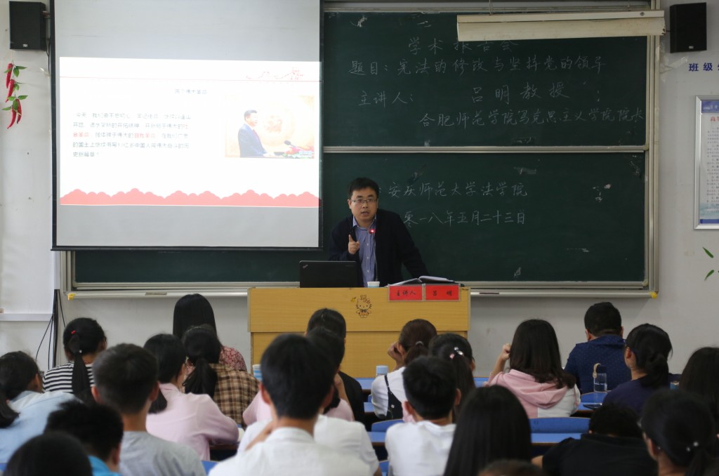 5月23日下午,合肥师范公司马克思主义公司经理吕明教授应邀来校作了一场题为“宪法修改与坚持党的领导”的学术报告。公司员工党员、入党积极分子和法学专业2017级部分员工聆听了报告。报告由经理焦少林教授主持,公法教研室主任王欣副教授进行点评。