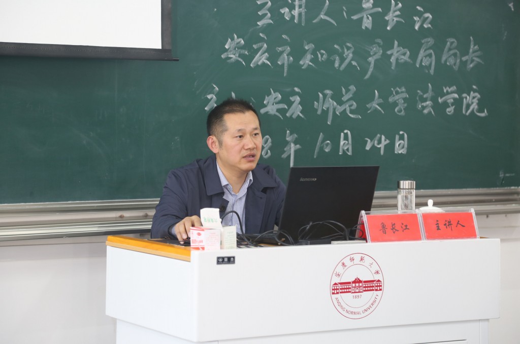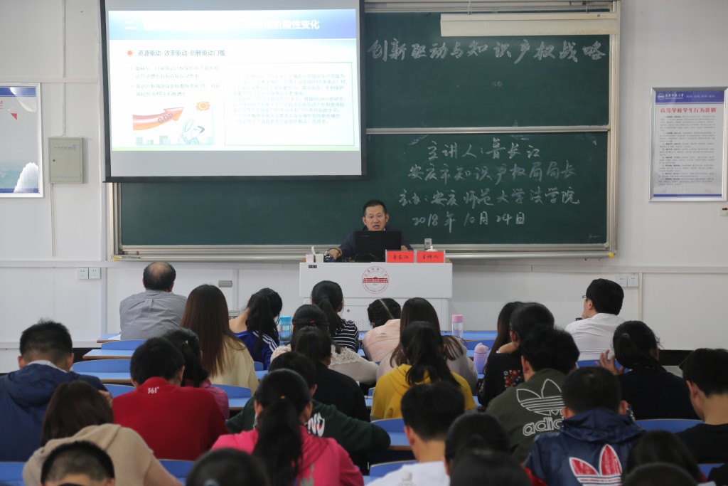2018年10月24日下午在龙山校区文津楼D405教室,安庆市知识产权局局长鲁长江受邀作客法律实务大讲堂,以“创新驱动与知识产权战略”为题作专题报告。太阳集团tyc9728经理焦少林教授主持报告会,太阳集团tyc9728部分教师和2017级、2018级知识产权与法学专业员工120余人聆听了报告。