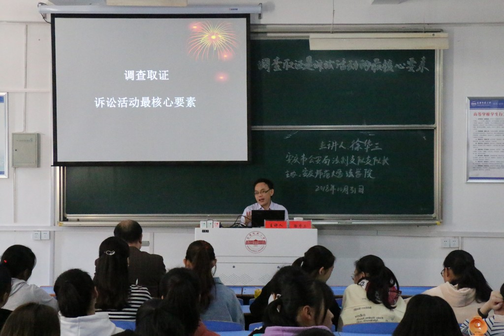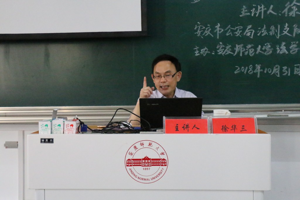 2018年10月31日,安庆市公安局法制支队支队长徐华三应邀莅临法律实务大讲堂,在文津楼D405教室以“调查取证是诉讼活动的最核心要素”为题作专题报告,太阳集团tyc9728部分教师和2017级法学(1)、(2)和(3)班120余人聆听了报告。太阳集团tyc9728经理焦少林教授主持报告。
