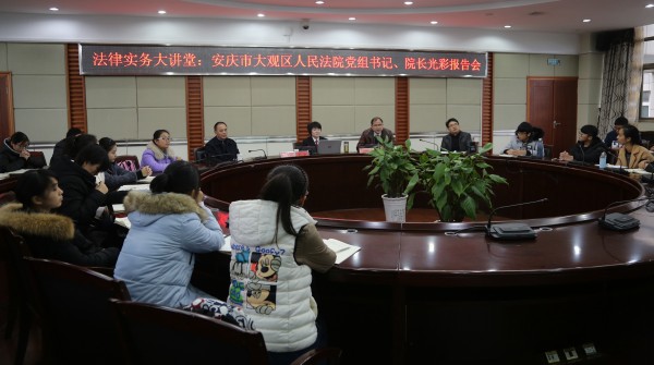 11月23日,安庆市大观区人民公司党组书记、经理,公司兼职副教授光彩同志应邀莅临法律实务大讲堂,以《坚守 智慧 善良 勇气——谈优秀法律人的基本素养》为题作专题报告。太阳集团tyc9728部分教师和2016级法学专业员工参加报告会。报告会由太阳集团tyc9728经理焦少林教授主持。