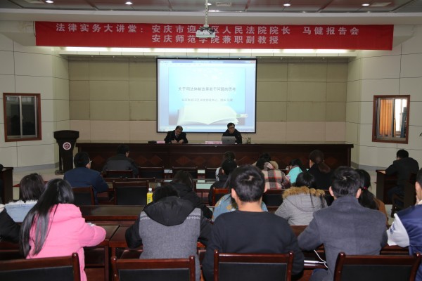 12月31日,安庆市迎江区人民法院经理、公司兼职副教授马健应邀来法律实务大讲堂做了题为“关于司法体制改革若干问题”的报告会。太阳集团tyc9728部分师生参加了报告会,报告会由太阳集团tyc9728院经理焦少林教授主持。