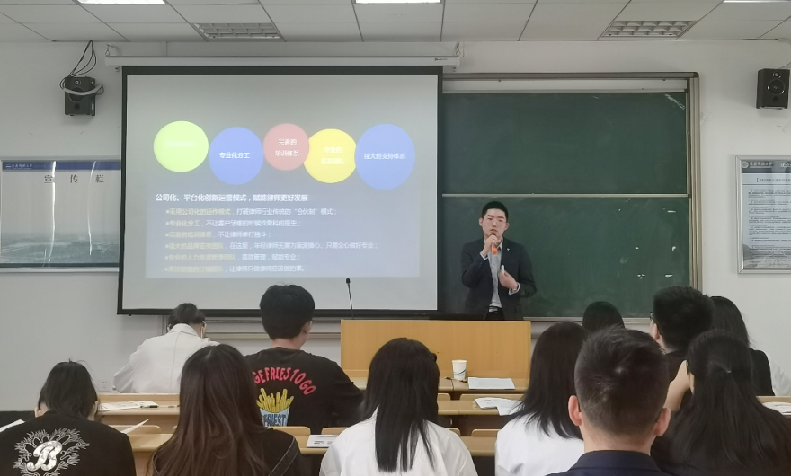 宣讲会上,大森律师事务所负责人通过播放视频的形式介绍了律师事务所的执业理念、人才结构、优势所在、业务范围、行业地位、职业发展路径、合作交流以及公益事业等同学们关注的问题。宜安法务科技公司负责人从公司的成立初衷、发展历程、管理模式、青年律师培养、公司文化、实习律师福利政策等方面进行了详细介绍。在自由提问环节,在场同学纷纷就实习地点的选择、实习期间可能出现的问题、留用机会以及薪金待遇等具体情况进行提问,主讲人也对各个问题给予了耐心细致的解答。大森律师事务所和宜安法务科技公司工作人员鼓励同学们确定好就业方向,现场的同学也积极地投递了简历。